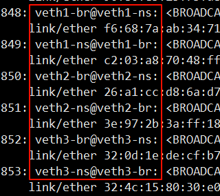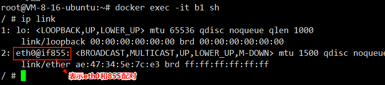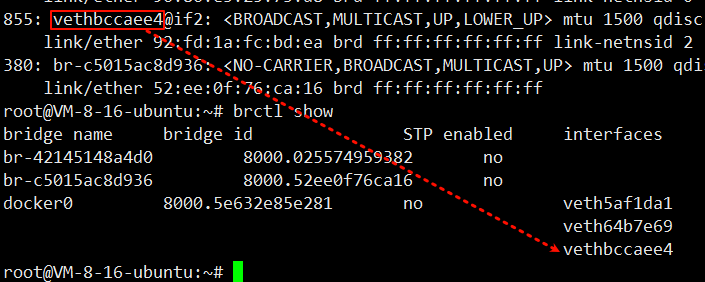宿主机上表示855和2配对,这就知道了容器内的网卡和宿主机的网卡的配对了。