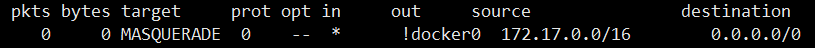 in * / out !docker0 出站接口 不能是 docker0(即"离开主机的真实网卡"时才生效,也就是访问外部网络)。避免把 docker 内部流量又伪装一次。