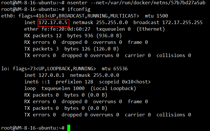 执行命令 nsenter --net=/var/run/docker/netns/57b7bd27a5ab