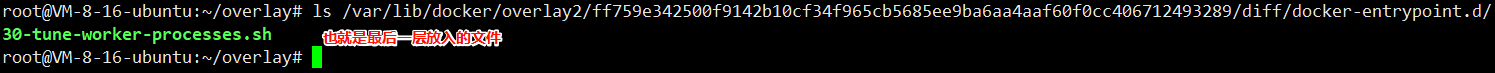查看UpperDir,执行命令 ls /var/lib/docker/overlay2/ff759e342500f9142b10cf34f965cb5685ee9ba6aa4aaf60f0cc406712493289/diff/docker-entrypoint.d/