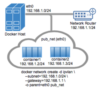 docker network create -d ipvlan --subnet=192.168.1.0/24 --gateway=192.168.1.1 -o ipvlan_mode=l2 -o parent=eth0 pub_net