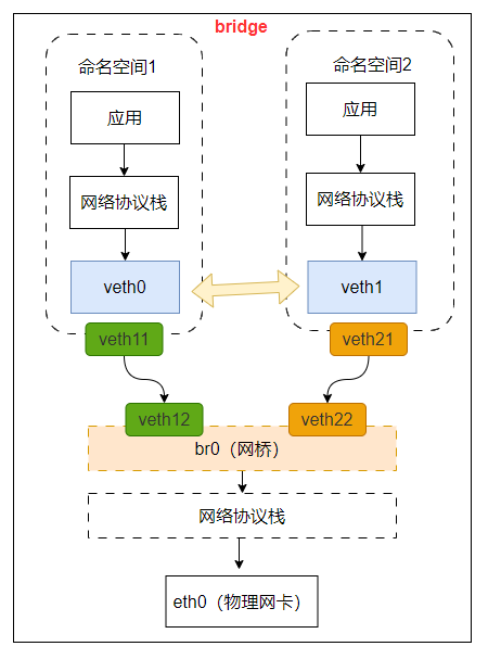 请求通过容器内部 eth0 发送至 veth pair 的另一端,到达 veth0,也就是到达了网 桥(docker0)处;