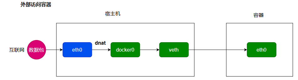 veth pair 的 veth0 将请求发送至容器内部的 eth0,最终交给内部服务进行处理。 使用 DNAT 方法,可以使得 Docker 宿主机以外的世界主动访问 Docker Container 内 部服务。