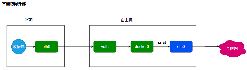 宿主机处理请求时,使用 SNAT 对请求进行源地址 IP 转换,即将请求中源地址 IP (容器 IP 地址)转换为宿主机 eth0 的 IP 地址;