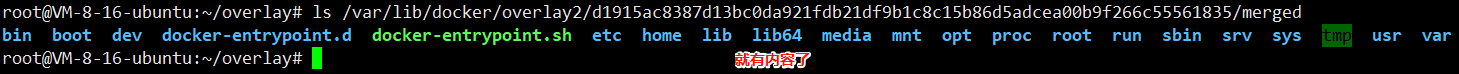 查看MergedDir,执行命令 ls /var/lib/docker/overlay2/ff759e342500f9142b10cf34f965cb5685ee9ba6aa4aaf60f0cc406712493289/merged
