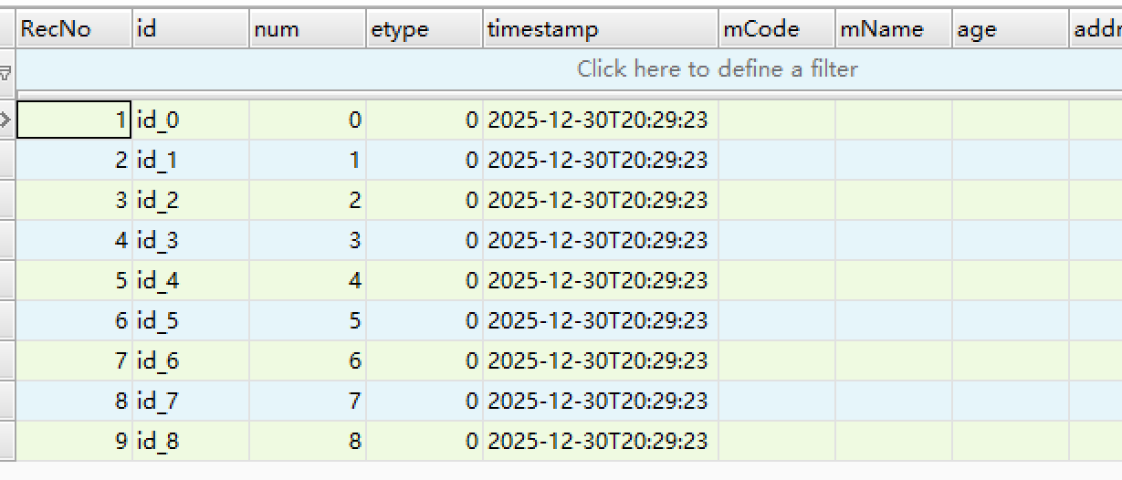 SELECT id, num, etype, timestamp, mCode, mName, age, addr, mac, remark FROM result_data