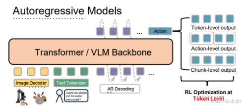 工作原理 :这类模型借鉴了自然语言处理中的语言模型,将机器人的动作序列看作一串"动作词元(token)"。模型像生成一句话一样,一个词元一个词元地(step-by-step)预测动作。RL 可以直接利用模型在预测每个词元时的概率分布,进行基于词元级别的监督和优化。 例如,