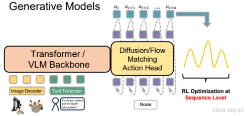 工作原理 :为了解决自回归模型在动作序列上可能存在的时序不一致问题,研究者们转向了可以直接生成整个动作轨迹的生成模型,例如扩散模型(Diffusion Models) 或 流匹配模型(Flow-matching)。这类模型一次性生成一个完整的、平滑的动作序列。