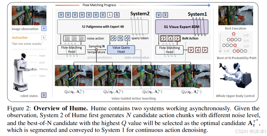 Hume模型中,高层系统会采样生成多个可能的动作方案,然后RL被用来训练一个价值函数,从中选择一个对于底层VLA来说最可行、最有价值的方案去执行。