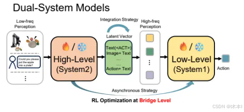 高层规划系统 (System-2):通常是一个VLM,负责理解人类的长期指令,并将其分解为一系列的子任务或步骤。