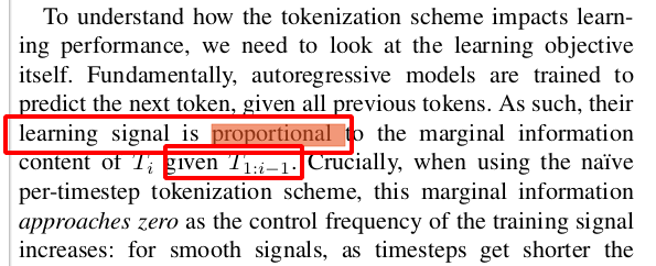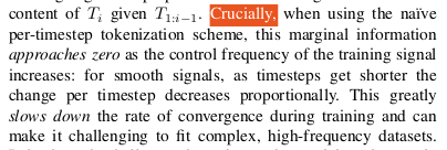 朴素的逐时间步 tokenization(per-timestep tokenization) 方法时, 随着控制频率的提高(as the control frequency increases),在**平滑信号(smooth signals)**的情况下:时间步长变短