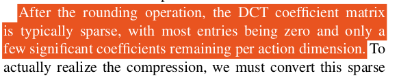 在取整之后,DCT 系数矩阵通常呈现出稀疏性(sparse):大多数条目为零(most entries being zero),每个动作维度仅保留少量显著系数(a few significant coefficients)。