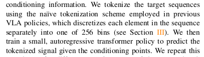 我们首先使用朴素 tokenization 方法(naïve tokenization scheme)对目标信号进行离散化,该方法正是此前多种 VLA 策略所采用的方式。