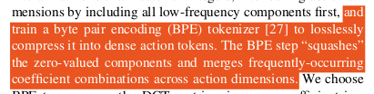 随后,我们训练一个字节对编码(Byte Pair Encoding, BPE) tokenizer,对展平后的一维整数向量进行无损压缩(losslessly compress),从而得到稠密的动作 tokens。该步骤能够压缩大量零值分量,并合并在不同动作维度之间频繁共现的系数组合。