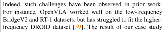 例如,OpenVLA 在低频数据集(如 BridgeV2、RT-1)上表现良好