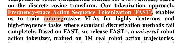 在看配置之前 ,我们先整理下 pi0-fast: frequency-space action sequence tokenization. 看看 和pi0 有什么差别.