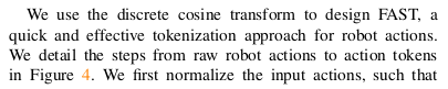 我们借鉴离散cos 变换(DCT) 设计了 FAST(Frequency-space Action Sequence Tokenization),一种用于机器人动作的快速而高效的 tokenization 算法。FAST 的完整流程如图 4 所示。