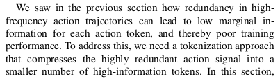 为机器人动作设计更好的 tokenization 方案(better tokenization schemes)是至关重要的.否则,即便使用强大的自回归 Transformer,在高频控制场景下也会由于学习目标的信息退化(information collapse) 而失败。
