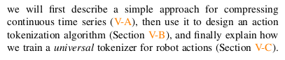 大量冗余(redundancy),会让每个动作 token 的边际信息量(marginal information)变得很低,从而导致训练表现差(poor training performance)。为了解决这个问题,需要一种 tokenization 方法:把高度冗余的动作信号(highly redundant action signal)压缩(compress)成更少但信息量更高的 token(high-information tokens)。接下来作者的安排是:先介绍一种简单的连续时间序列压缩方法(compressing continuous time series)(V-A),再用它设计动作 tokenization 算法(action tokenization algorithm)(V-B),最后说明如何训练一个通用动作 tokenizer(universal tokenizer)(V-C)。