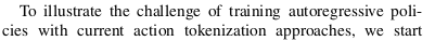 为了说明当前动作 tokenization 方法在训练自回归策略(autoregressive policies)时所面临的挑战,我们从一个简单的教学性案例(didactic example 开始。