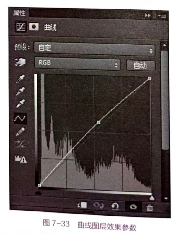 (11)在不取消选区的前提下,在图层面板底部单击 "创建新的填充或调整图层" 按钮,在弹出的菜单中选择 "曲线" 图层效果,在弹出的面板中设置 "曲线" 图层效果参数,其中预设为自定,单击中间的调整曲线适当调整一个弧度,如图 7-33 所示。
