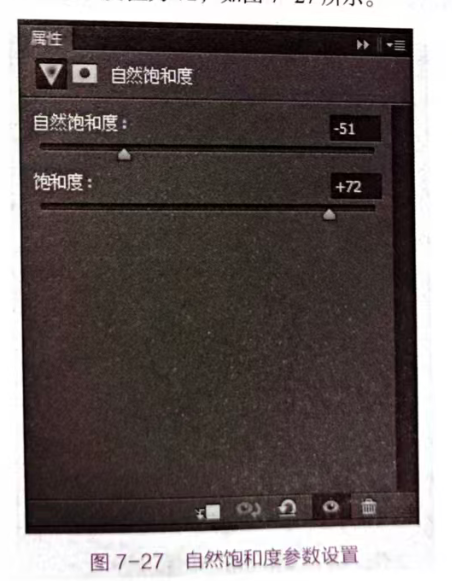 (5)在不取消选区的前提下,在图层面板底部单击 "创建新的填充或调整图层" 按钮,在弹出的菜单中选择 "自然饱和度" 图层效果,在弹出的面板中设置 "自然饱和度" 图层效果参数,其中自然饱和度值为 - 51,饱和度值为 72,如图 7-27 所示。