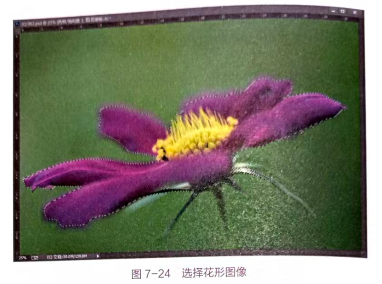 (2)在图层面板将素材图像图层进行复制备份,然后在 Photoshop 的工具箱中选取魔棒选择工具,容差值设置为 30,在图像的背景区域点选,然后按住 Shift 键,在没有被选中的图像区域反复的点选,直到背景图像几乎全部被选,然后执行 "Ctrl+Shift+I" 反选命令,将选区反转,效果如图 7-24 所示。