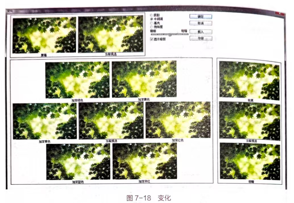 打开 "变化" 对话框,如图 7-18 所示。对话框顶部的两个缩览图显示调整前和调整后的图像。