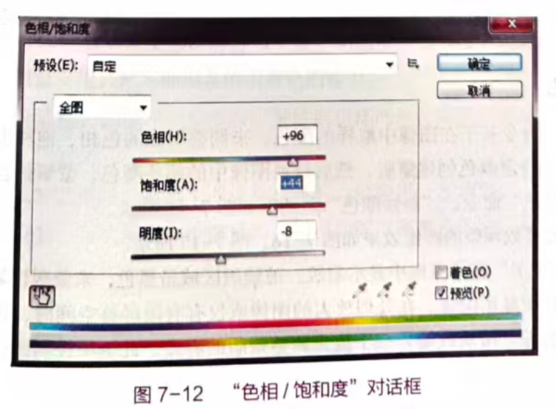 也可以使用 "着色" 选项将颜色添加到已转换为 RGB 色彩模式的灰度图像,或添加到 RGB 色彩模式的图像,通过将颜色值减到一个色相,使其看起来像双色调图像。执行命令打开色相 / 饱和度对话框,如图 7-12 所示。