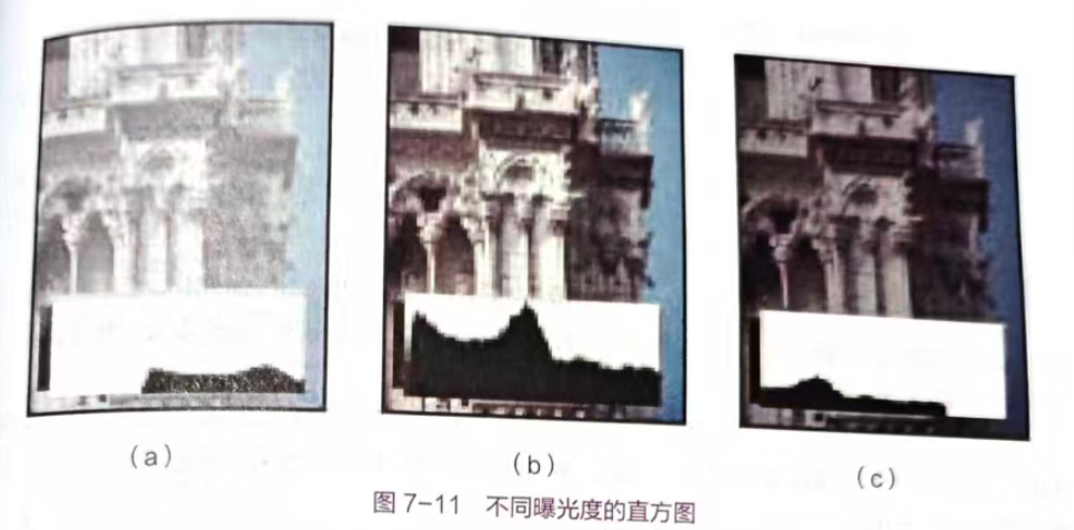 图 7-11 中,(a)为曝光过度照片及其直方图,(b)为正确曝光照片及其直方图,(c)为曝光不足照片及其直方图。在 Photoshop 中,用户可以使用直方图面板查看图像信息,也可以在 "图像 / 调整" 菜单命令下的色阶和曲线命令查看并调整。