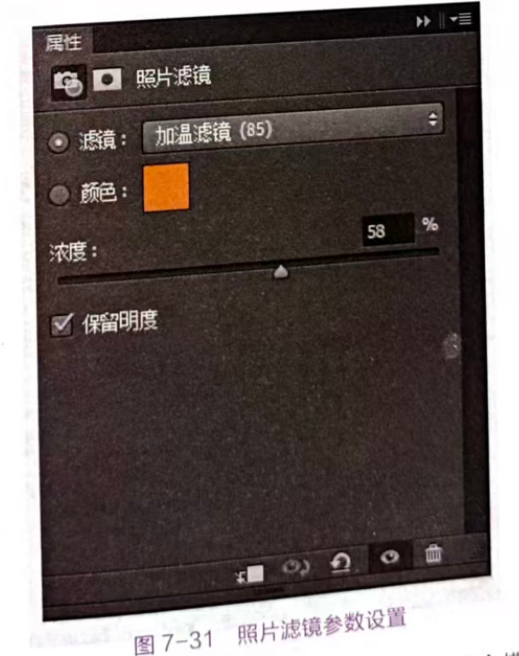 (9)在不取消选区的前提下,在图层面板底部单击 "创建新的填充或调整图层" 按钮,在弹出的菜单中选择 "照片滤镜" 图层效果,在弹出的面板中设置 "照片滤镜" 图层效果参数,其中滤镜类型为加温滤镜,浓度为 58%,如图 7-31 所示。