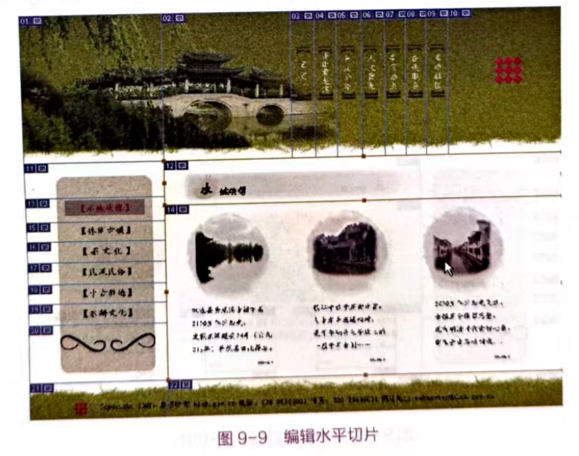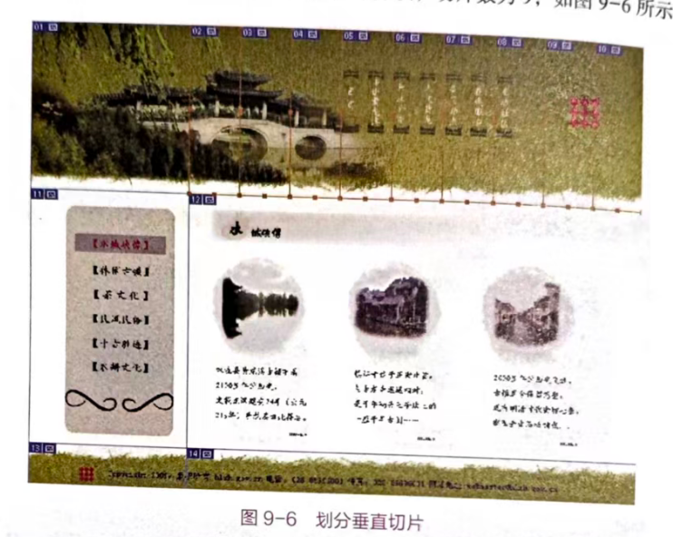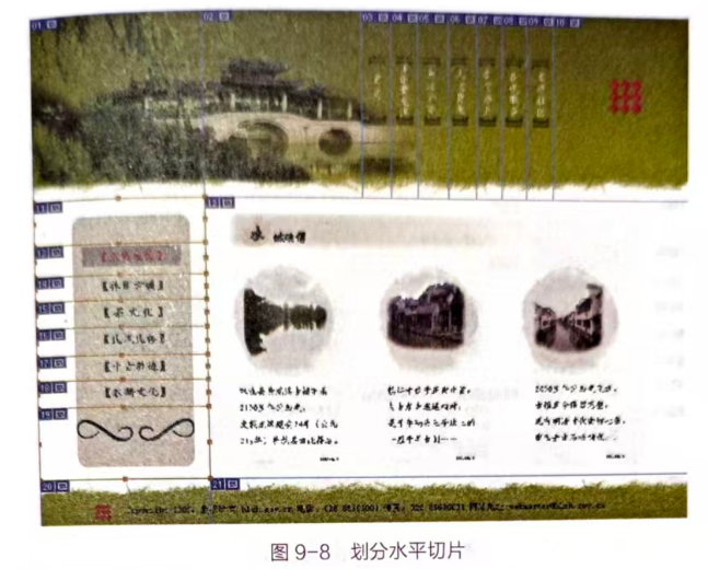 (7)用 "切片选择" 工具选择 "切片 11",单击右键,在弹出的菜单中选择 "分割切片",设置切片为水平分割,切片数为 8,并用工具对各个分割出来的切片根据图像进行调整,效果如图 9-8 所示。