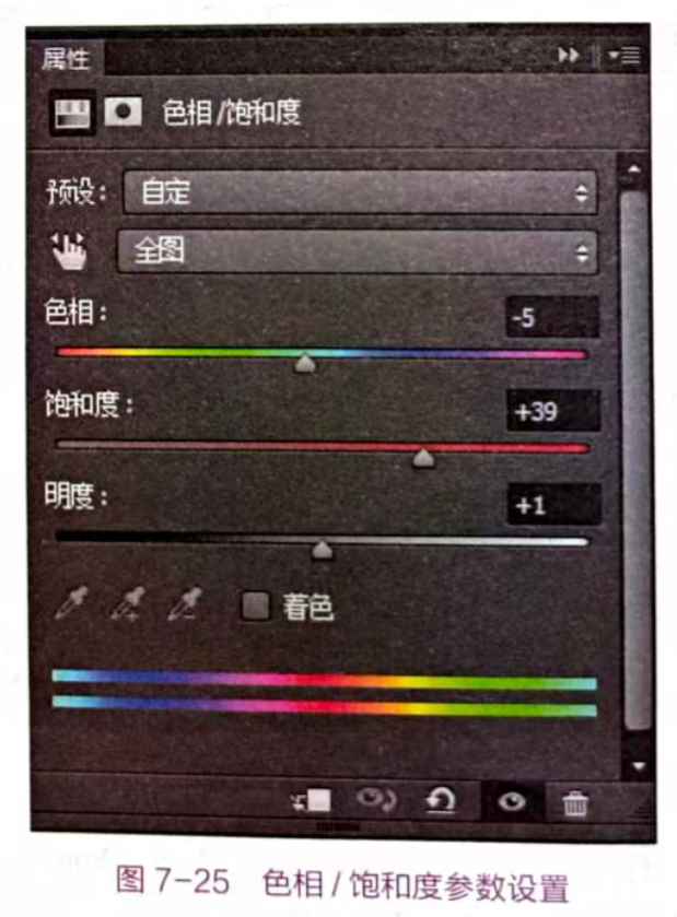 (3)在不取消选区的前提下,在图层面板底部单击 "创建新的填充或调整图层" 按钮,在弹出的菜单中选择 "色相 / 饱和度" 图层效果,在弹出的面板中设置 "色相 / 饱和度" 图层效果参数,其中预设为自定,应用范围为全图,色相值为 - 5,饱和度值为 39,明度值为 1,如图 7-25 所示。