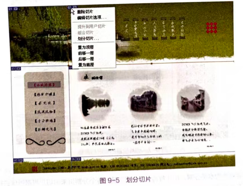 (4)选区工具箱中的 "切片选择工具",在图像中选择 "切片 02",单击鼠标右键,在弹出的菜单中选择 "划分切片" 命令,如图 9-5 所示。