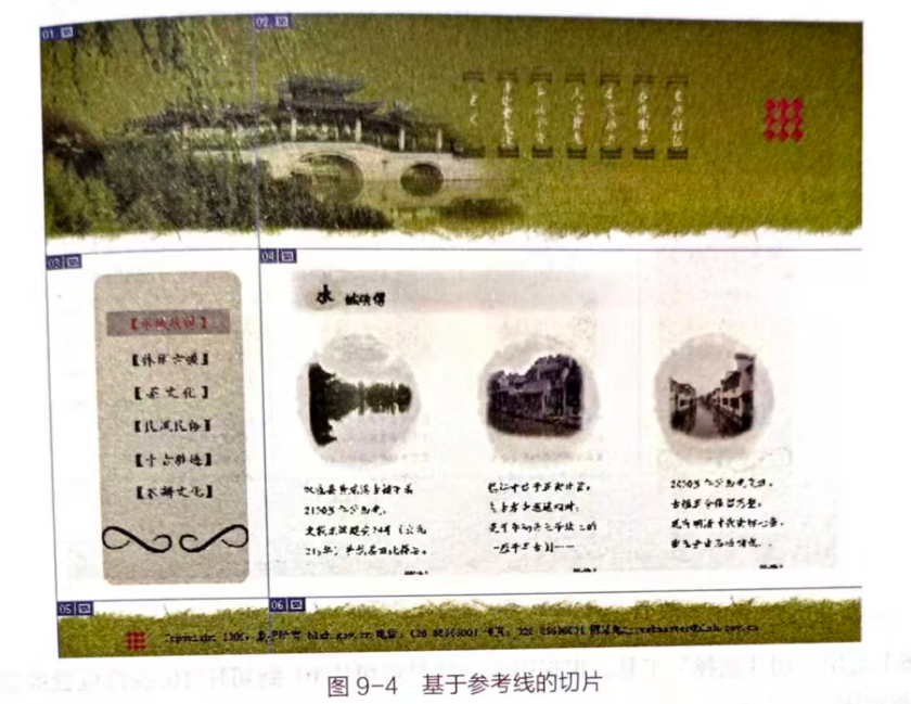 (3)选择工具箱中的 "切片工具",在工具属性中设置样式为 "正常",然后单击 "基于参考线的切片" 按钮。根据参考线生成切片,如图 9-4 所示。
