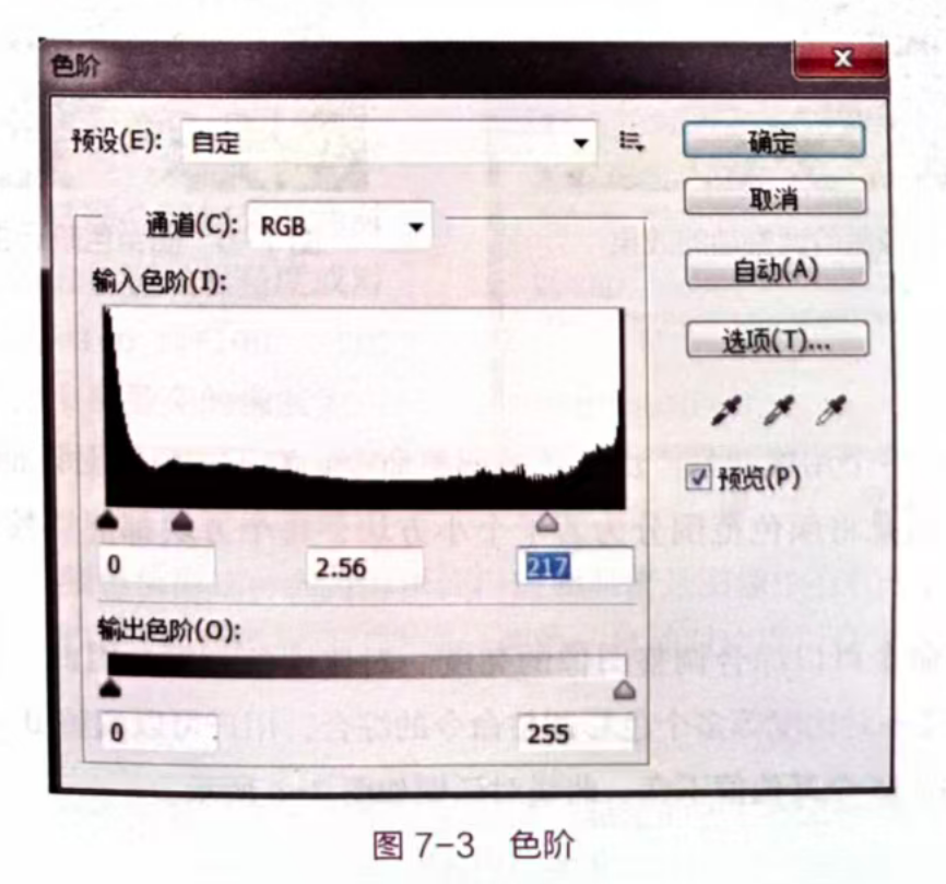 色阶命令能够精确地手动调整色阶。执行色阶命令后,会打开色阶对话框,如图 7-3 所示。