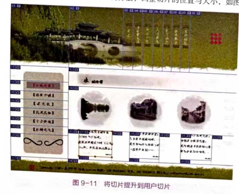 (10)应用相同的方法,分别为第二排和第三排文字根据图层的方式建立切片,并使用鼠标右键单击选择 "将切片提升到用户切片" 的方法,调整切片的位置与大小,如图 9-11 所示。