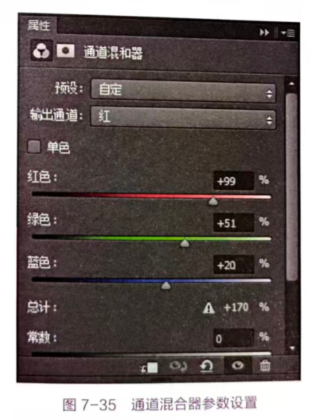 (13)在不取消选区的前提下,在图层面板底部单击 "创建新的填充或调整图层" 按钮,在弹出的菜单中选择 "通道混合器" 图层效果,在弹出的面板中设置 "通道混合器" 图层效果参数,其中预设为自定,输出通道为红色,红色值为 99%,绿色值为 51%,蓝色值为 20%,常数值为 0%,如图 7-35 所示。