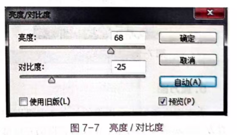 执行亮度 / 对比度命令,打开亮度 / 对比度对话框,拖移滑块以调整亮度和对比度(如图 7-7 所示):