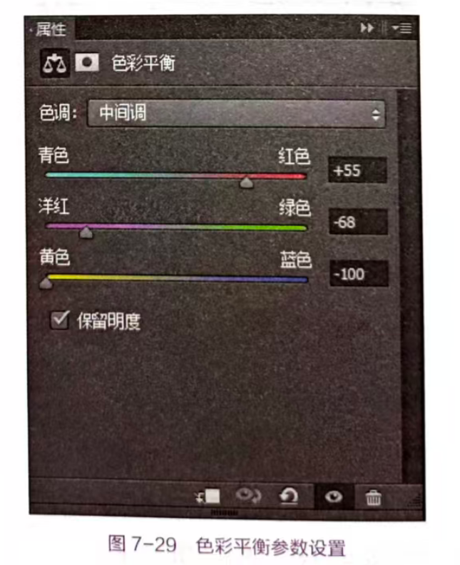 (7)在不取消选区的前提下,在图层面板底部单击 "创建新的填充或调整图层" 按钮,在弹出的菜单中选择 "色彩平衡" 图层效果,在弹出的面板中设置 "色彩平衡" 图层效果参数,其中色调为 "中间调",青色与红色平衡值为 55,洋红与绿色平衡值为 - 68,黄色与蓝色平衡值为 - 100,如图 7-29 所示。