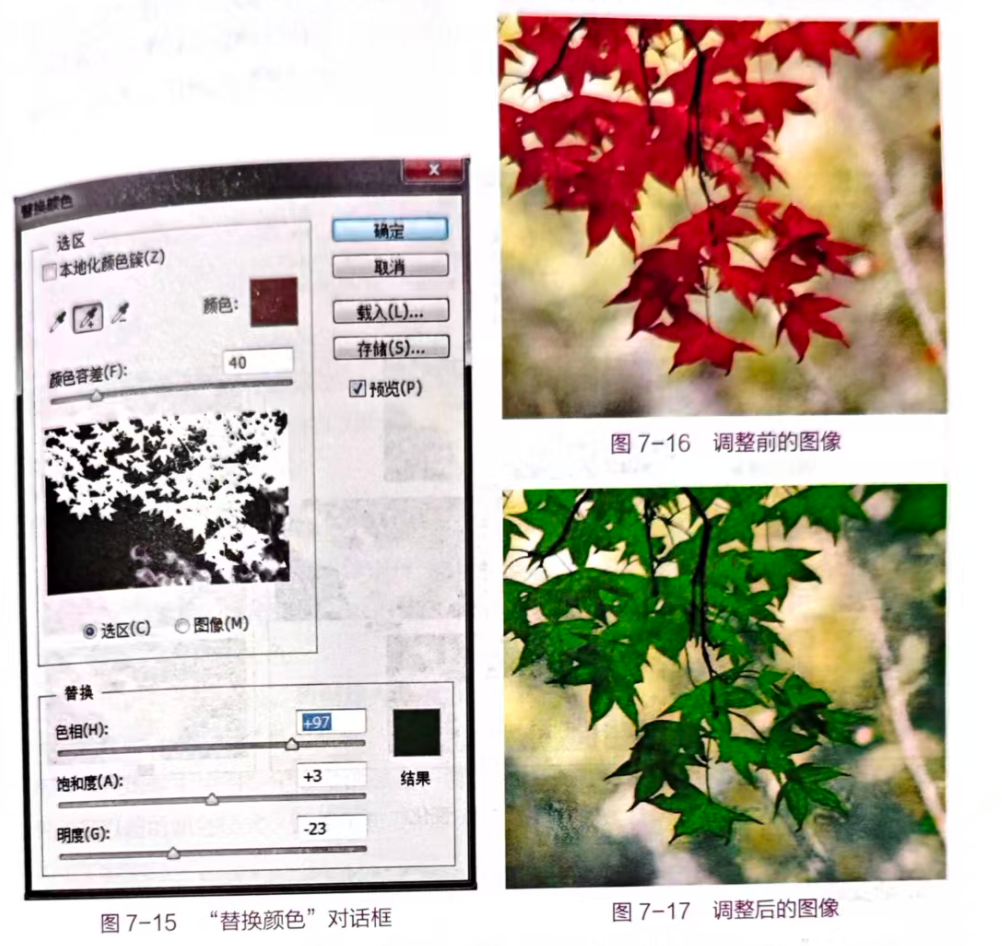 "替换颜色" 命令基于在图像中取样的颜色,来调整图像的色相、饱和度和明度值。实际上是在图像中基于特定颜色创建蒙版,然后替换图像中的那些颜色,蒙版是暂时的。选取 "图像 --- 调整 --- 替换颜色" 命令,"替换颜色" 对话框如图 7-15 所示。