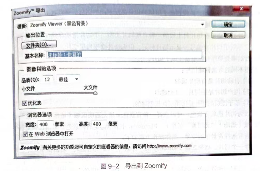 (1)选择 "文件 --- 导出 ---Zoomify" 并设置导出选项,如图 9-2 所示。模板设置在浏览器中查看的图像的背景和导航。输出位置指定文件的位置和名称。图像拼贴选项指定图像的品质。浏览器选项设置基本图像在查看者的浏览器中的像素宽度和高度。
