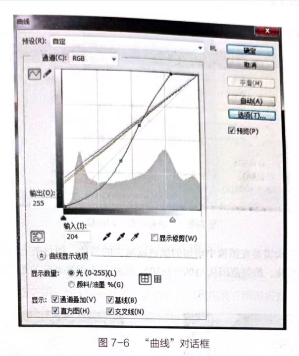 利用曲线调整命令可以综合调整图像的亮度、对比度色彩等。因此,该命令实际上是反相、色调分离、亮度 --- 对比度等多个色彩调整命令的综合,用户可以调整 0~255 范围内的任意点,同时又可以保持 15 个其他值不变。曲线对话框如图 7-6 所示。