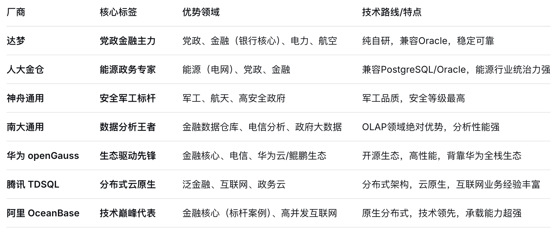 信创国产化数据库是信创产业的核心环节,市场已形成 "四大传统豪门 + 新兴力量 + 生态巨头" 的清晰格局。不同厂商在产品路线、技术特性和优势领域上各有侧重。