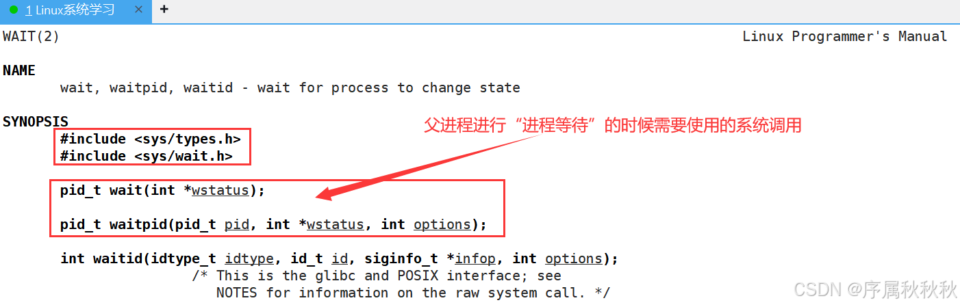 wait:用于使父进程暂停执行,等待其子进程终止,并获取子进程的退出状态