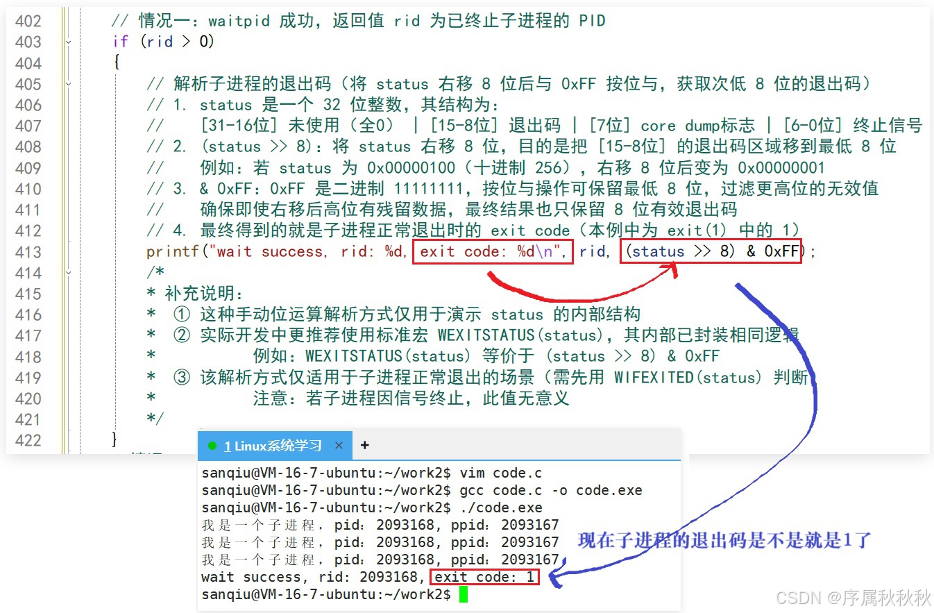 这是进程等待最核心的价值,通过清理僵尸进程的 PCB,避免内核资源泄露,保障系统稳定- 可选但常用的:获取子进程退出信息