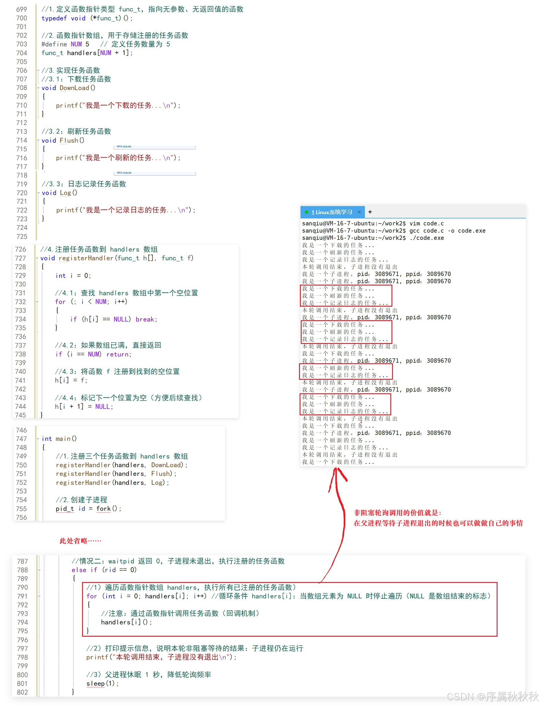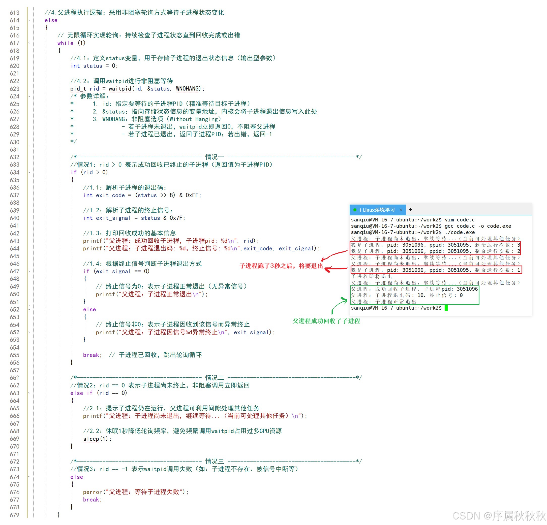 //4.父进程执行逻辑:采用非阻塞轮询方式等待子进程状态变化