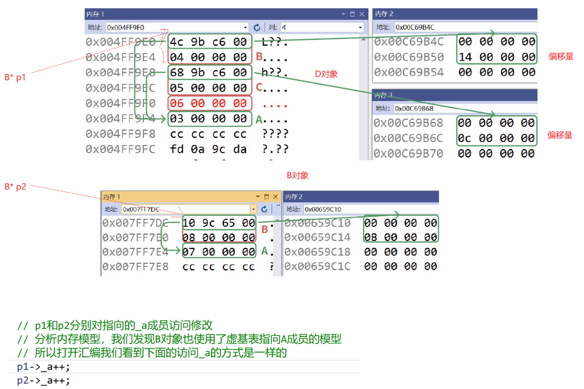 // 分析内存模型,我们发现B对象也使用了虚基表指向A成员的模型