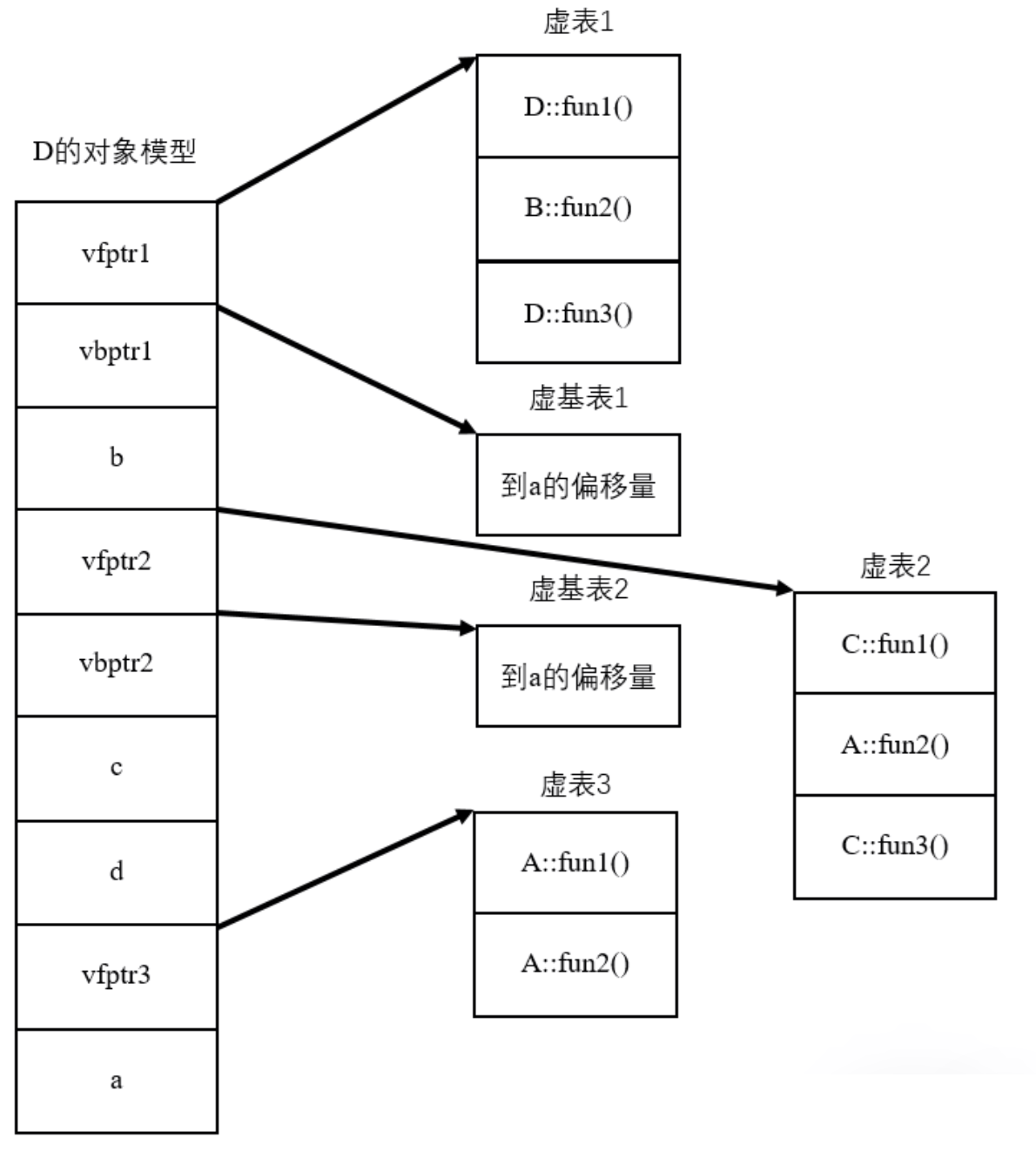 • 通过下面的简化菱形虚拟继承模型,我们可以看到,D对象中的B和C部分中分别包含一个指向虚基表的指针 ,B指向的虚基表中存储了B对象部分距离公共的A的相对偏移量距离 ,C指向的虚基表中存储了C对象部分距离公共的A的相对偏移量距离。这样公共的虚基类A部分在D对象中就只有一份了,这样就解决了数据冗余和二义性的问题。 • 通过B的对象模型,我们发现菱形虚拟继承中B和C的对象模型跟D保持的一致的方式去存储管理A,这样当B的这指针访问A时,无论B指针切片指向D对象,还是B指针直接指向B对象,访问A成员都是通过虚基表指针的方式查找到A成员再访问。