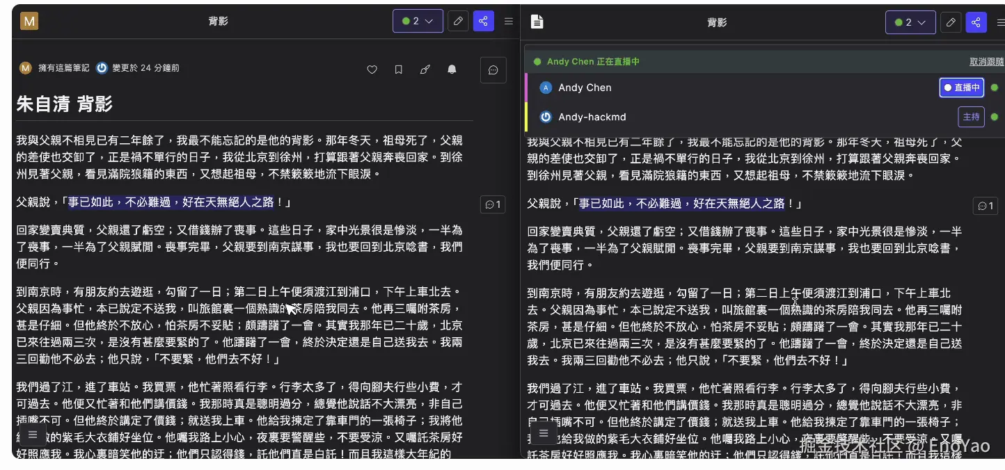hackmd.io/s/live-host... 会议指引,跟随功能。 借助协同编辑的功能加上目前在线人员列表,用于主持人在主导会议的时候,使用跟随或者不跟随的功能,主导会议进程与同步信息。